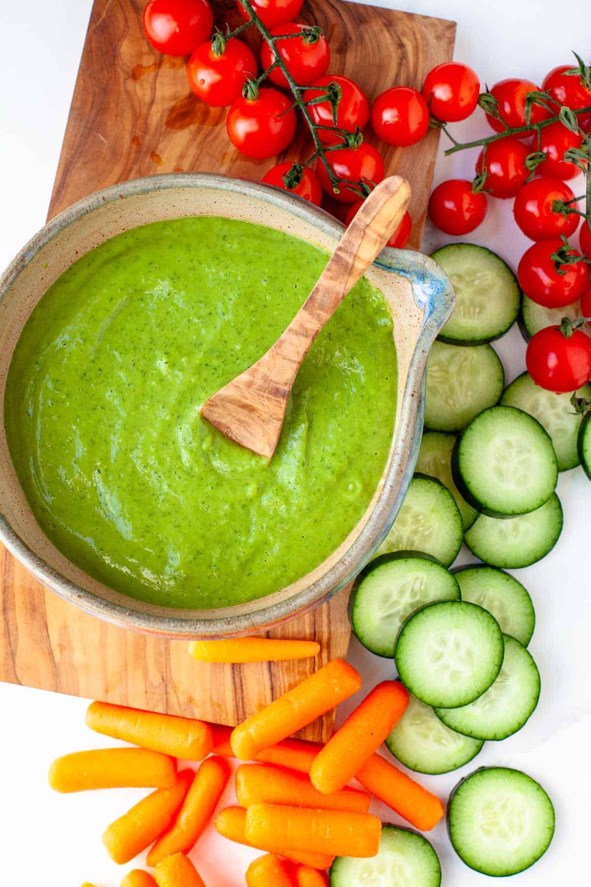 Vegan Green Goddess Dressing in serving bowl with wooden spoon on top of wooden cutting board and next to fresh veggies for dipping.